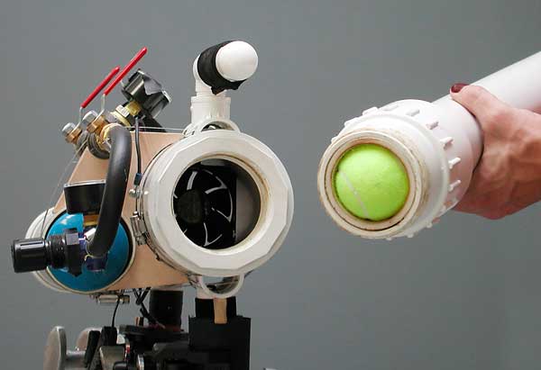 The 3" chamber opening on the L3 allows tennis balls to be breech loaded. They fit tightly inside a 2.5" barrel and load quickly. The tennis balls shot at more consistent velocities than spuds but slightly less consistent than the gasket slugs used in previous tests.