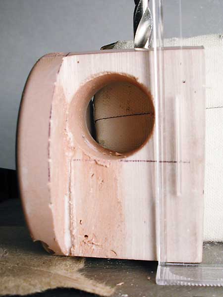 Draw a center line on one of the flat sides, this will help align the vortex hole with the center of the 2" plug. A drill press with a 3/4" forstner bit is used to create a smooth vortex hole in the block. Align the hole with the bottom of the block and the center line. The 3/4" vortex hole goes on the half closest to the muzzle. The hole here is a little high on one side. Bondo can be used to fix this or a new block can be cut from scratch.