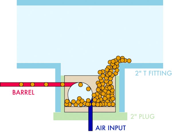 A cutaway view of the T fitting shows the vortex block in place. The T fitting must be sealed on all three sides which will force the incoming air and BB's through the barrel.