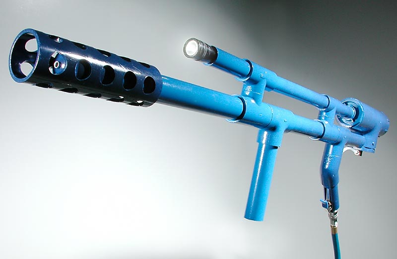 This handle is made from 1" PVC pipe. The storage hook may need to be cut away from the blowgun for it to fit inside. An area of the pipe is cut away the width of the nozzle as pictured above. A 3/4" hole in the back of the handle helps the trigger lie flat inside.