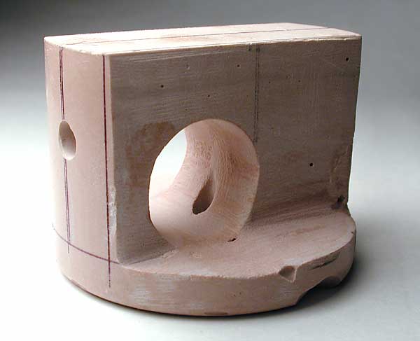 The vortex block is the most difficult part to construct and also the most important. The raw block can be made of any smooth, solid material. Solid PVC rod cut to shape is the ideal solution but could be hard to get. A block of hardwood might also work once turned to a suitable diameter. The block pictured here is made from bondo body filler which works well if made carefully.