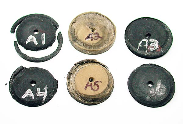 The key to improving performance with all gaskets was to reduce the diameter from 7/8" to 13/16". This modification increased velocity, reduced friction and decreased rubber deposits in the barrel. The smaller size also helped extend gasket life. The hi-density neoprene proved to be the fastest, most durable rubber and was selected as the final choice. Gasket A1 is 7/8" neoprene shot through barrel B 16 times. Gasket A4 is 13/16" neoprene shot through barrel B 16 times as well and shows improved wear and higher speeds. Gasket A6 is the finalized 13/16" neoprene gasket used in our C:B tests. This was shot 16 times through barrel C and still shows some excessive wear. The addition of a small washer behind the gasket helps eliminate the angled wear around the edge and was used in the final design. This worn A6 gasket shoots about the same speed as a brand new one.