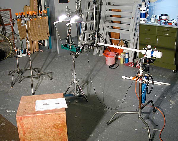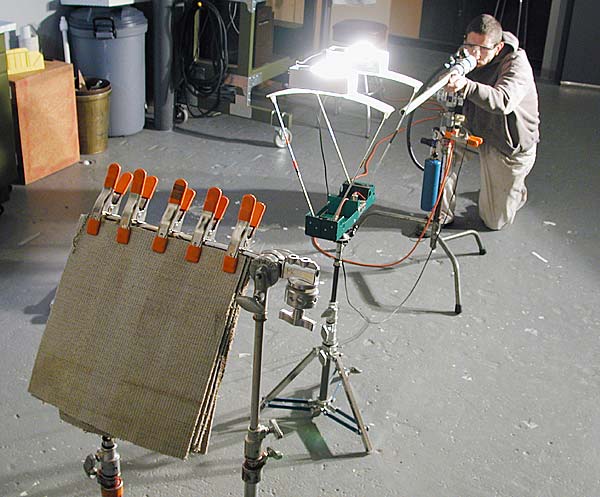 The gasket slug tests were performed indoors using squares of carpet to catch the ammo. The carpet worked fair but would cause dangerous ricochets if stacked too thick. A double catch setup was made with 2 layers up front and 5 in back. This worked well but safety glasses were required for the occasional ricochet. A Chrony F1 chronograph was placed 2' from the muzzle to record the velocity of each shot. This same equipment would be used in the final C:B test.
