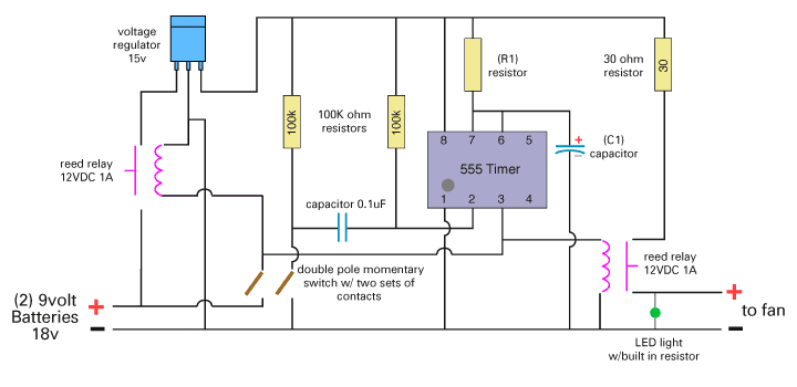This is the revised schematic for the fan controller circuit wich eliminates the problem of unintentional battery drain. It uses two reed relays to isolate the timer circuit from the power source. The relays are small enough to fit inside the pictured project box alongside the batteries and the additional resistor will fit on the main board. It is also possible to use smaller switching components like transistors in place of the relays. This circuit uses a double pole (DP) switch which triggers the two separate circuits at the same time providing 12v at the fan. The toggle style power shutoff switch has been eliminated from the design but is easy to add next to the battery if desired. Large fans running at 12v can easily vent or mix in 2-3 seconds, 26 seconds is a little overkill. This circuit features a bit of circuit protection so crossing your output wires on accident shouldn't cause any harm.