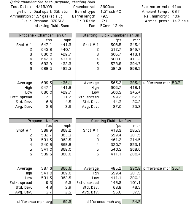 Chamber fans are fantastic. They are one of the few modifications to provide the triple benefit of convenience, reliability and performance. A self ventilating chamber is a luxury that becomes difficult to do without. The consistent fuel mixture helps reduce misfires and can elevate the reliability of standard BBQ igniters. The most significant benefit is the dramatic increase in velocity. A small 50mm fan in a 4" chamber has been shown to increase muzzle velocity by over 60 MPH. Click the chart to the right to see the dramatic effects of a chamber fan using propane and spray propellants.
