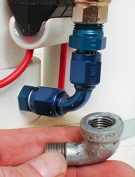 Use a 1/4" NPT thread tap to cut threads in the hole you just created. NPT threads are tapered to create a better seal. This item can be found at a plumbing supply or some hardware stores. Use clear grease to lubricate the bit while cutting. Check that your street elbow is truly 90° before tapping.