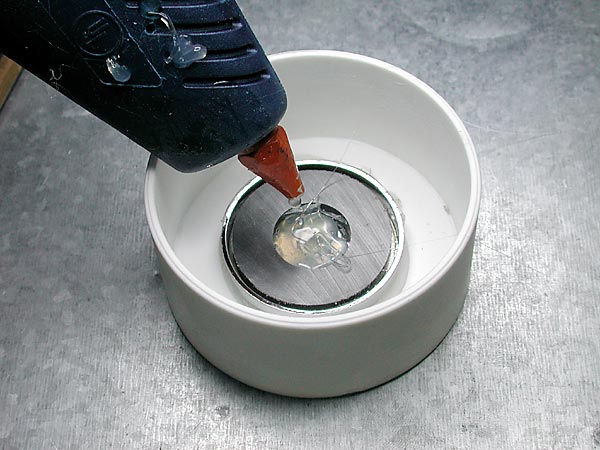 The cap is attached to the sewer pipe using PVC cement forming a permanent bond. This makes it hard to re-glue the magnet, so get it in there good the first time. The holder is then lashed to the combustion chamber in the traditional manner using pipe clamps or your imagination.
