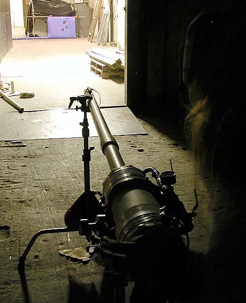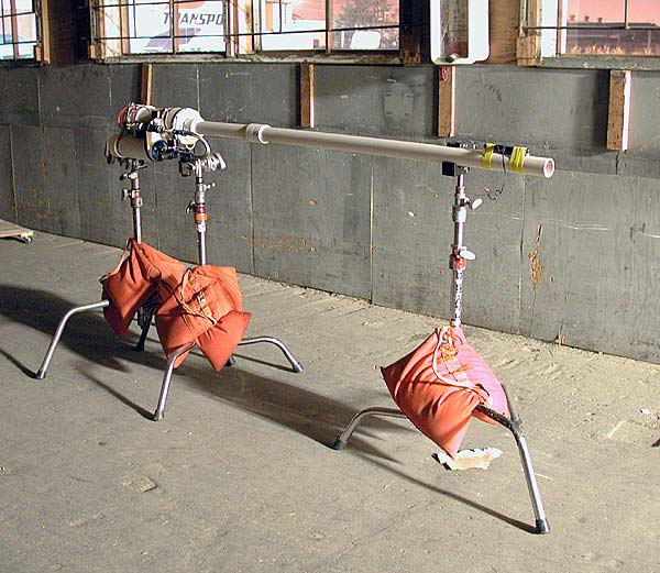 The combustion chamber was attached to Hollywood style "shorty" C-stands using mafer clamps. The stands were weighted down with sandbags and fitted with nonskid feet. A third stand secured the barrel near the muzzle allowing quick barrel changes. This setup did not move at all, the laser sight came up in the same spot after each shot and after each barrel change. A high speed video did reveal a slight flexing of the stands and the barrel.