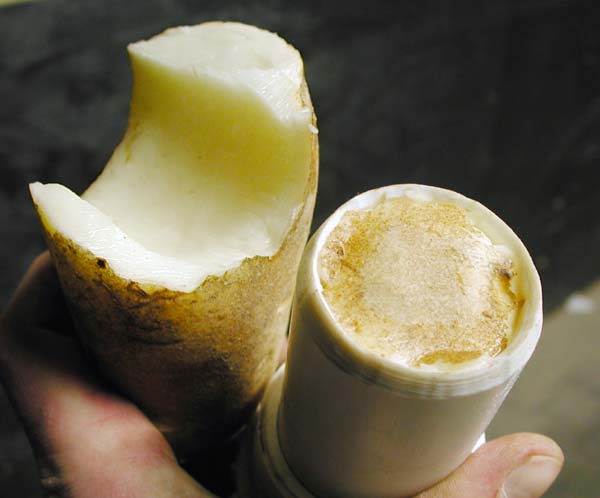 The ammo for this test was hand selected Russet and Baby Red potatoes. 6 shots of each were fired through the rifled and smooth bore barrels. The Red potatoes created a slug 1.75" thick and the Russet slugs were about 2" thick. The slug cutter used works great but the speed and simplicity of the breech barrel knife on the SpudTech barrel was the clear winner.