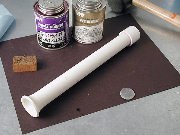 Prime and cement the end cap to the tip of the rocket. This is a good chance to use up some of that purple primer that's been kickin' around. Check the expiration date on the bottom of the can.