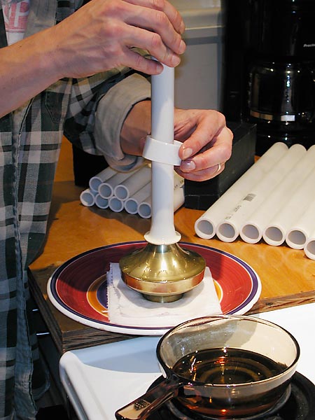 Prepare the pipe by cutting, deburring and washing to remove anything that would cause the oil to splatter. If the pipe is washed with water, dry it completely inside and out to avoid severe oil splatter. Heating the oil is the toughest part, Bring the oil up to temperature slowly. It takes longer to cool the oil down than to heat it up so take your time. In a small pan (not your wife's or Mom's), heat about .6" of cooking oil until it will soften PVC. If the oil smokes, it is way too hot. Place one end of the pipe in the oil and hold. After about 20 seconds the PVC will begin to soften allowing you to start the bell shape flare on the bottom of the pan. Spin the pipe to achieve an even shape.