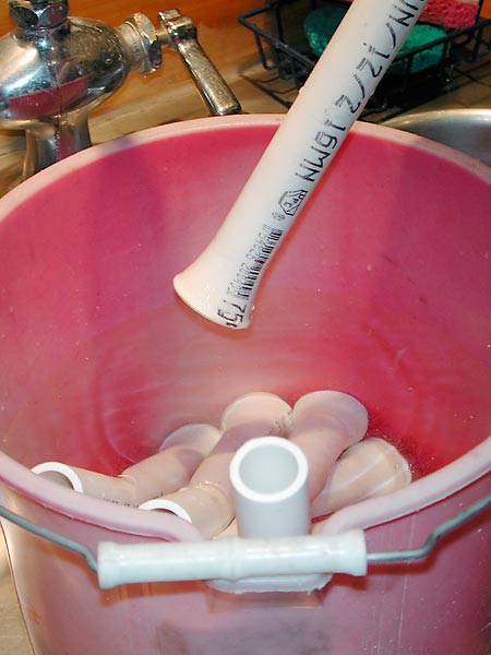 Hold the union together to prevent the pipe from backing out of the tapered fitting. The ring of cement is a good sign as it shows the joint is completely saturated. The plastics industry is undecided whether or not to wipe up this ring of cement. One group suggests the ring prevents the solvent from evaporating completely resulting in soft welds. They also advise that the solvent ring can soften the plastic underneath changing the weave of the polymers in the area. The other group proposes the solvent ring is a good thing by providing extra sealant and strength in high pressure applications. Both methods work well, what is more important is using the proper primer and cement.