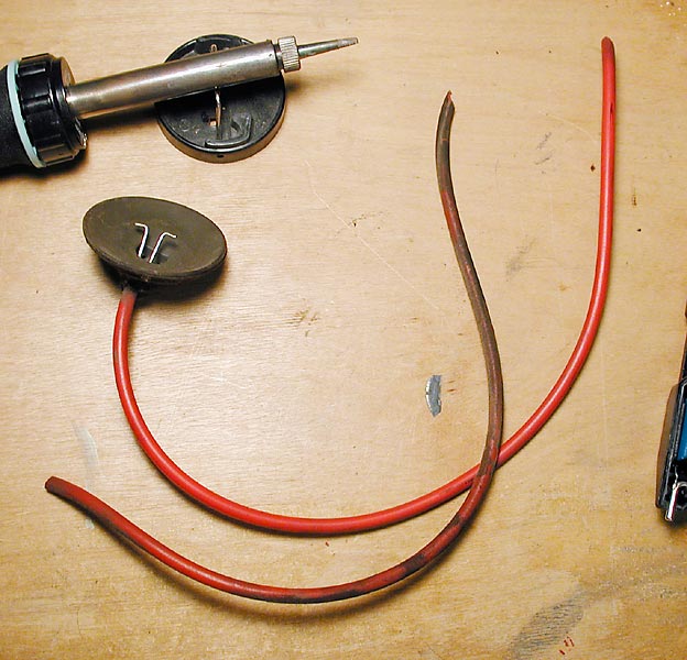 Solder your leads to each of the forward facing electrodes. This is a tricky solder job. For a proper union, all three surfaces must reach solder melting temperature. The electrode is thick and takes time to heat up. The black wire heats up fast and may require a heat sink (hemostat). Keep the joint streamlined so the electrode will fit back into position.